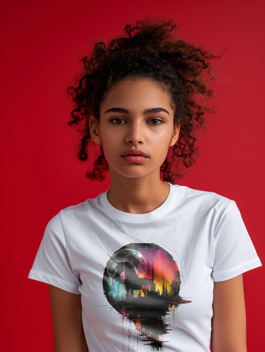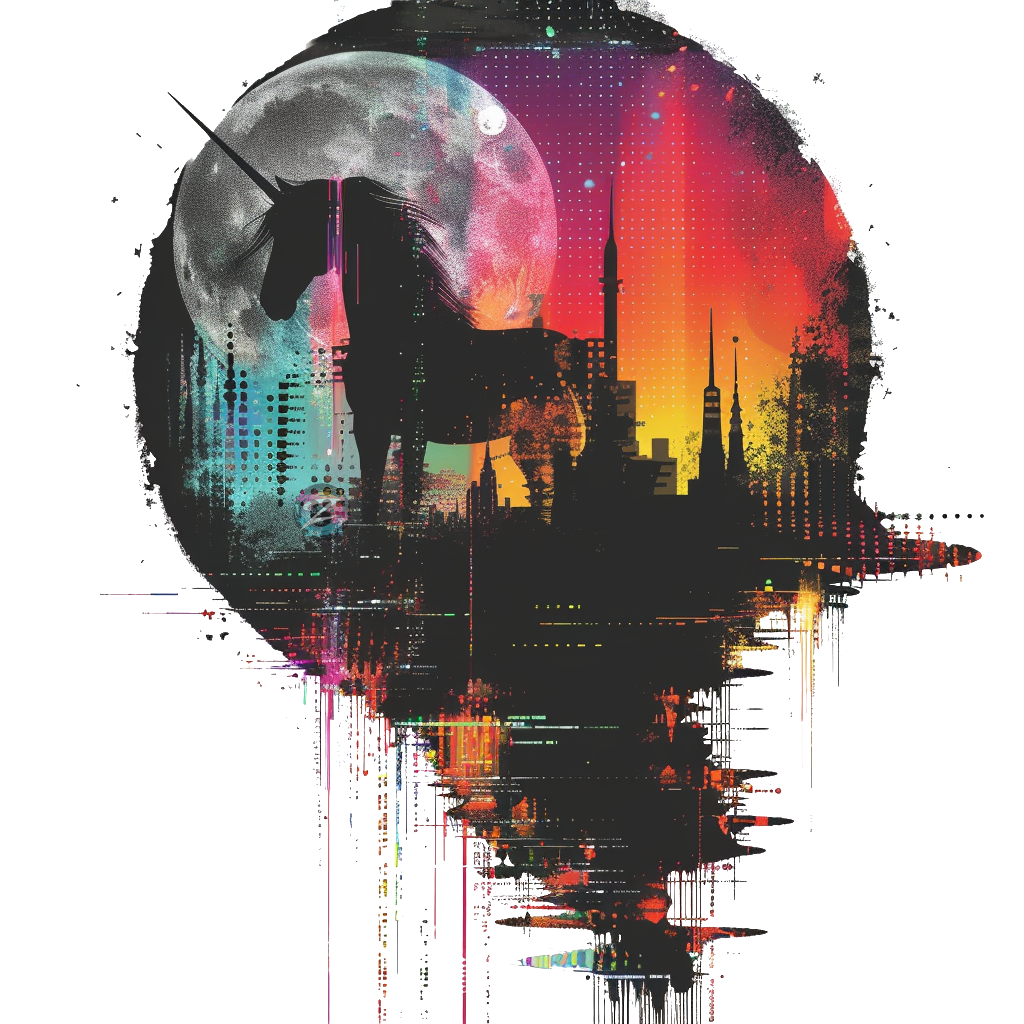 Step into a world of fantasy and urban flair with our Urban Unicorn T-Shirt. This stunning design features a majestic unicorn silhouette set against a vibrant, abstract cityscape backdrop. The artwork blends sunset hues of orange, pink, and purple with hints of teal and blue, creating a mesmerizing scene under a glowing full moon. The digital, pixelated effect adds a modern touch, making it perfect for those who love a mix of magic and metropolitan vibes.